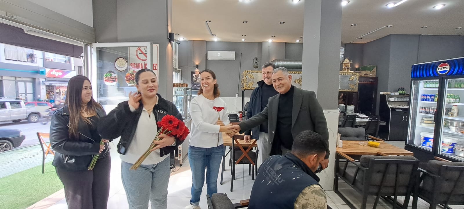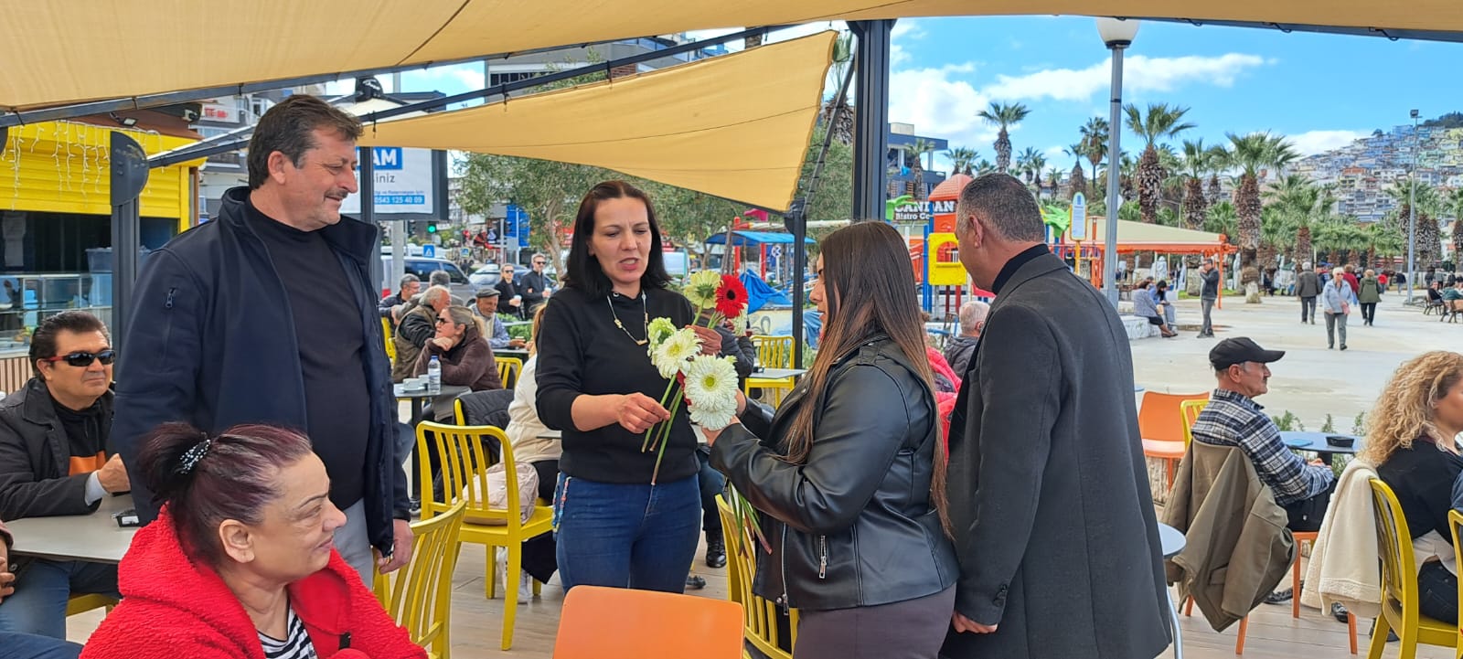 İlçe Kadın Kolları yönetimi ile İlçe Başkan Yardımcısı Menderes Kul’un da katıldığı programda önce emekçi kadınların çalıştığı iş yerleri ziyaret edildi, ardından Kuşadası sahilinde yüzlerce kadına çiçek dağıtıldı.
