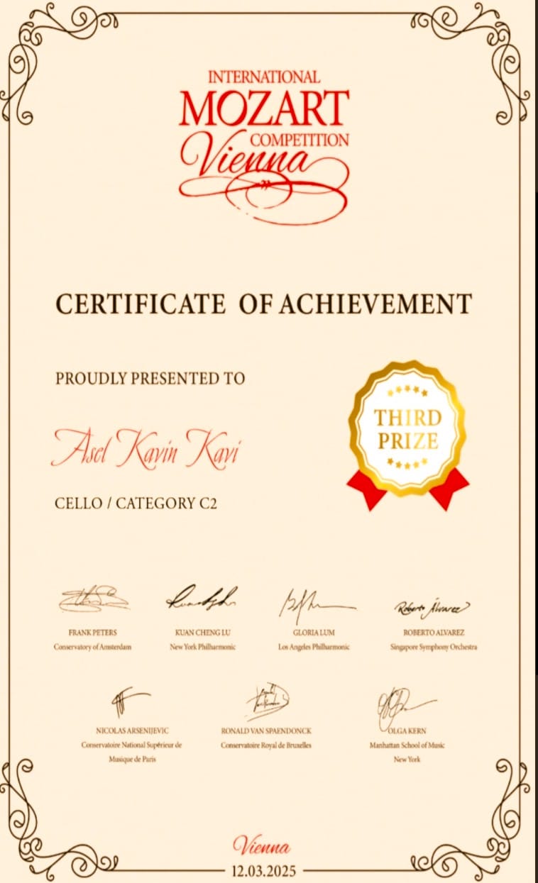 Adnan Menderes Üniversitesi Devlet Konservatuvarı Müzik ve Bale Ortaokulu 8. sınıf öğrencisi Asel Kavin Kavi, dünyanın dört bir yanından yetenekli genç müzisyenlerin katıldığı prestijli Mozart Competition Vienna 2025 yarışmasında, viyolonsel performansıyla dikkatleri üzerine çekti.