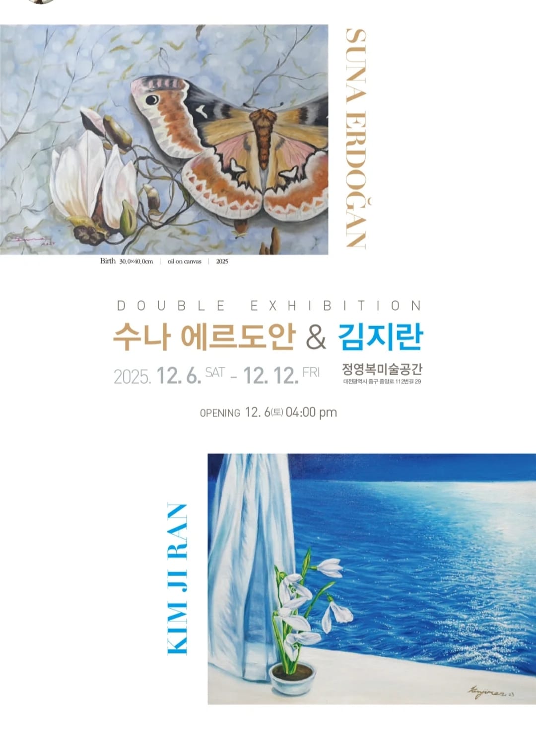 Koreli sanatçı Kim Jiran ile birlikte davetli sanatçı olarak katıldığı sergide Suna Erdoğan, uzun yıllardır üzerinde çalıştığı ve sanat çevrelerinde kendisiyle özdeşleşen “Kelebek Serisi” ile yer aldı. Kim Jiran ise doğadan ilham alan, ışık ve yansıma temelli çalışmalarıyla sergiye farklı bir boyut kazandırdı. Sergi, iki sanatçının doğa üzerinden kurduğu ortak dil ile izleyicilere kültürlerarası güçlü bir sanat deneyimi sundu.